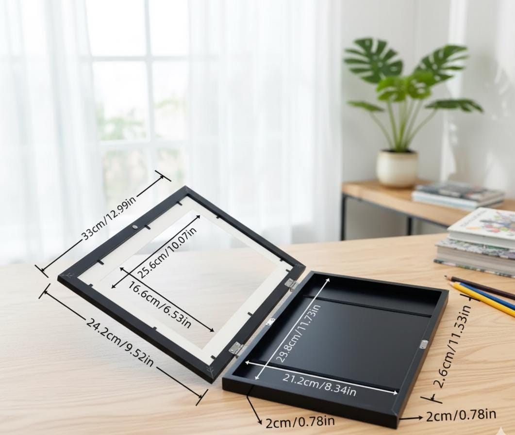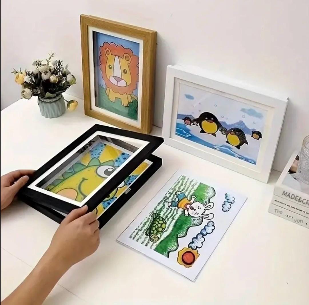 “Versatile picture frame, perfect for children’s artwork. Easily display and change photos, posters, or drawings on the wall instantly with the front opening. Sturdy, stylish, and flexible, it complements any interior. Ideal for quickly updating with the latest children’s creations. Mounts horizontally or vertically.”